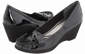 Style Description: Get the complete and attractive looks with the Bandolino Ebio. These stylish wedge style shoes can be used with the professional outfit to get the executive looks or with the casual outfit to get chic looks. They are lightweight and have cushioned and comfortable interior. The upper is available in synthetic patent and leather. The upper has the moc toe design along with strap and buckle detail at the vamp which gives these wedges a new and distinguish look. These wedges have the slip on construction like loafers which makes it very easy to wear and take off. The lining is made from the man-made material which is super comfy and draws the moisture away from the foot to keep it fresh and healthy. The footbed is comfortable and have sufficient cushioning to provide you with smooth wearing. The outsole is made from the durable rubber which offers traction for secure ride. Its heel is 2 ¾ inches high with ½ inches high platform. It weighs 8 ounces as per size 8. You can find this style in these colors: Black Synthetic Patent.