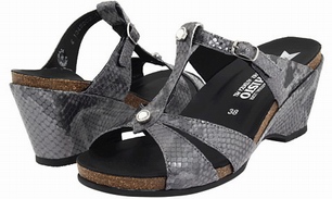Style Description: From office to shopping to dinner the Mephisto Nazli will go everywhere with you. These easy slip on style sandals have very lightweight construction. They have comfortable interior which ensures that you get maximum comfort for endless time. The upper is made from the original leather which has the two rhinestones on the top to give it exclusive looks. The upper also features strap and buckle closure at the instep which allows you to personalized the fit as per the convenience to get secure wearing. The footbed is made from the latex and cork and it is contoured. This footbed has ability to shape itself as per the shape of your foot by the passage of time to give personalized and fit of footbed. The footbed is wrapped with the leather which draws away the moisture from the foot to keep it odorless and dry. The outsole is made from the pure Caoutchouc rubber which is flexible and long lasting. This outsole also gives you shock and stress free walking by absorbing shocks. Its heel is 2 ½ inches high and it is completely wrapped with the leather. It weighs 8 ounces as per size 7. You can find this style in these colors: Purple Boa, Dark Brown Boa, Bronze Metallic Leather, Black Crinkle Patent and Black Ceylan.